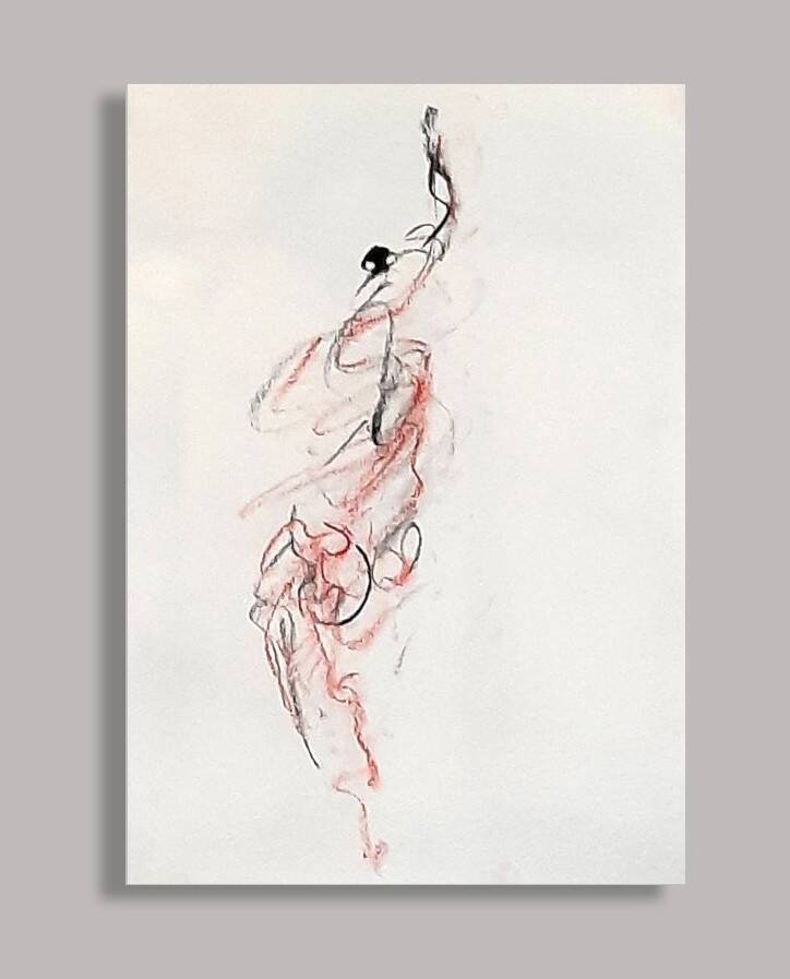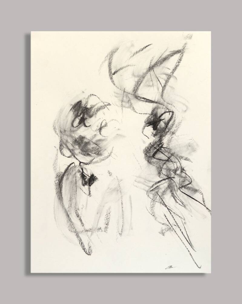 In het eerste deel van de performance vormt de fysieke en emotionele intensiteit van de dans de impuls voor mijn handelen als beeldend kunstenaar. De energie die uitgaat van Justines bewegingen vertaalt zich in spontane, intuïtieve beeldende reacties. De tekeningen ontstaan in enkele seconden, om zo de rauwe kracht, dynamiek en intensiteit van het moment te kunnen vastleggen.